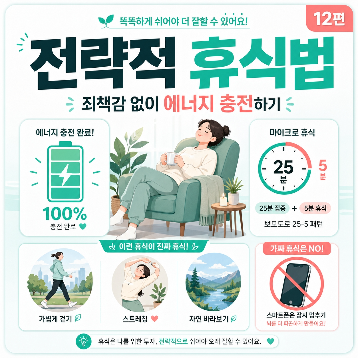 그 뼈아픈 경험을 통해 저는 깨달았습니다. '휴식은 일의 반대말이 아니라, 내일의 몰입을 위한 가장 적극적인 준비 과정'이라는 사실을요. 오늘 12편에서는 죄책감 없이 똑똑하게 쉬면서 에너지를 완벽하게 충전하는 '전략적 휴식법'에 대해 이야기해 보겠습니다.