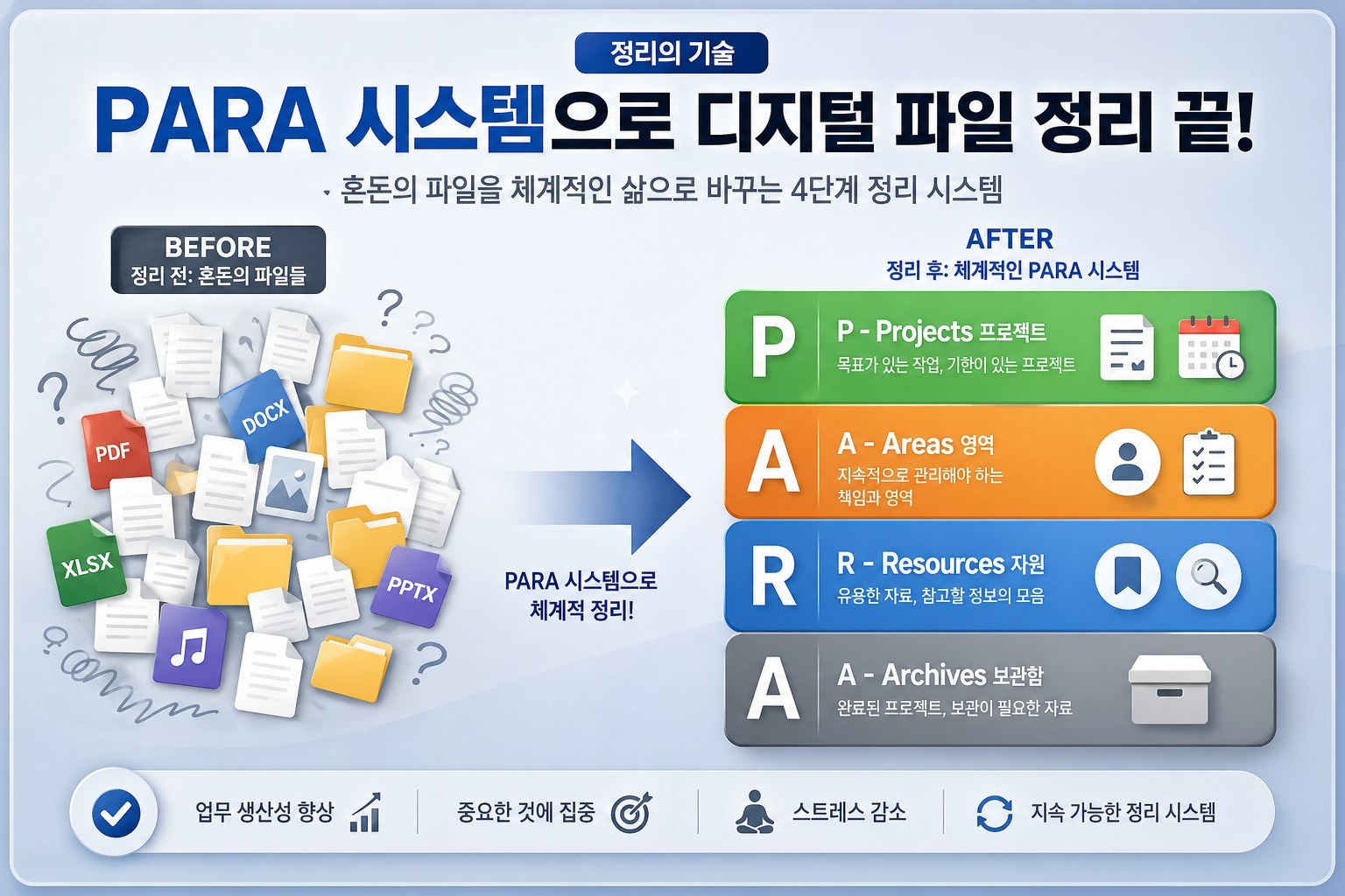 내 업무 환경(노션, 바탕화면, 구글 드라이브 등)의 최상위 폴더를 딱 이 4개로만 고정하는 것이 PARA 시스템의 시작이자 끝입니다.